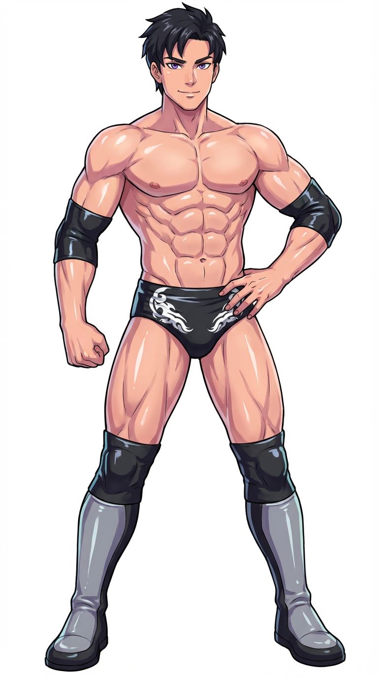 Smooth features and slightly fair, unblemished skin set the canvas. Expressive amethyst eyes are usually the first thing one will notice about him. Obsidian black hair tops his head, trimmed neatly short save for a few extended bangs allowed to hang over his right eye. Domino's body is lean, lacking in excess weight or bulk. His arms and legs are streamlined in smoothly-rippled muscle, chest toned and flat, and abdomen divided into a sleek six-pack.